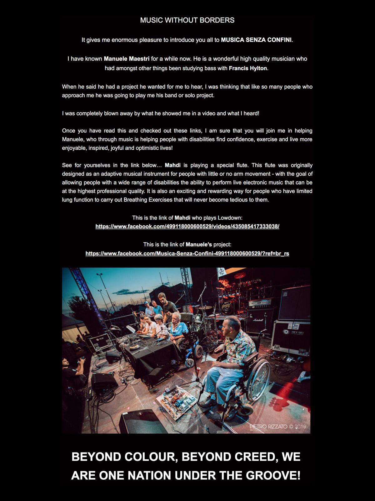 Il chitarrista, compositore e produttore discografico Jean-Paul “Bluey” Maunick, leader della band britannica acid jazz Incognito, è rimasto profondamente colpito dall’iniziativa di Manuele Maestri: Musica Senza Confini, music without borders.